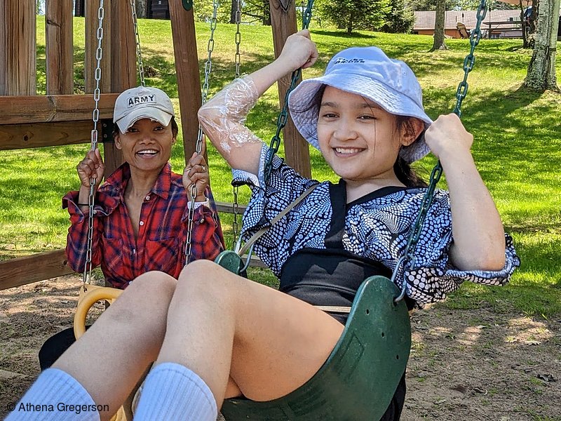 Clio and my mom were using the swings just outside the motel we were staying at -- Birch Point Resort in Hayward, WI.