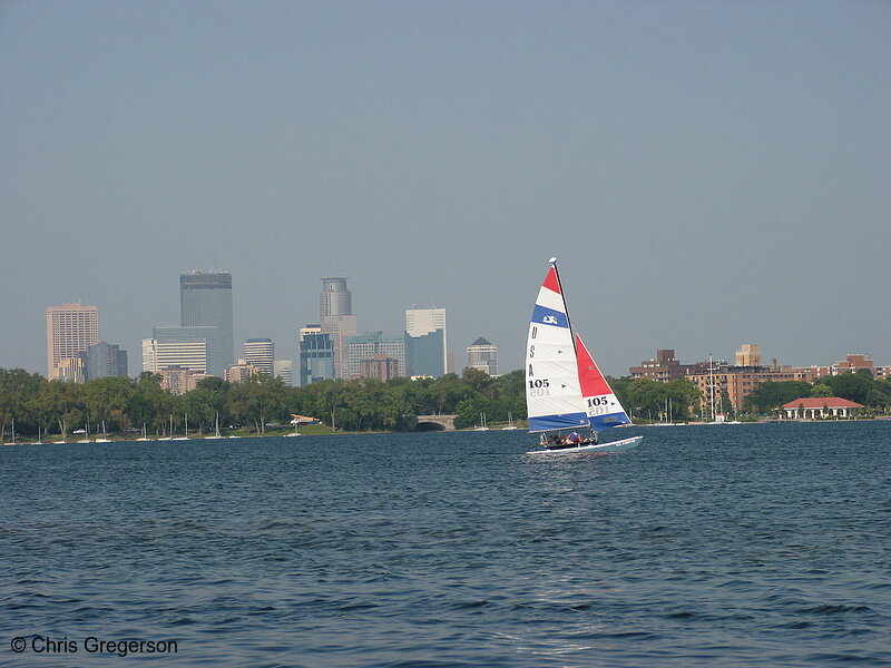You are on the west side of Lake Calhoun looking northeast at a sailboat. The downtown skyline is in the left background and the concession building is on the far right.