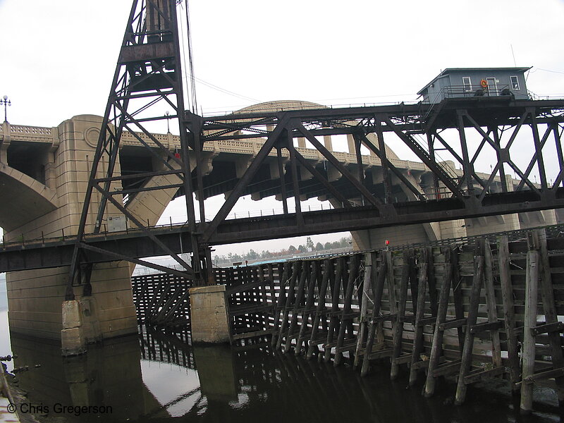 You are looking east on Shepard Road at the Robert Street Bridge, over the Mississippi River. A train bridge passes underneath this bridge. Downtown St. Paul is just north of here.